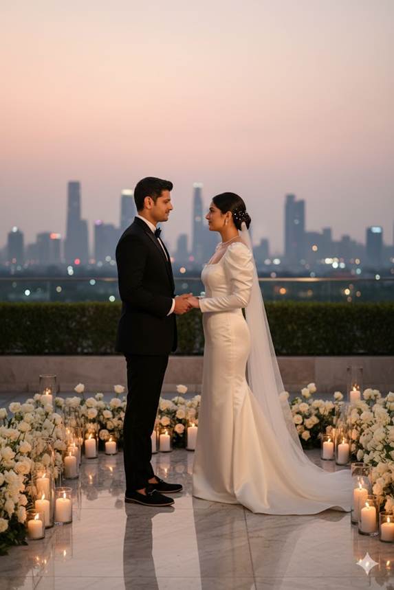 Visualize a modern wedding on a rooftop terrace bathed in soft evening light. The city skyline glows in the distance, the horizon fading into peach and lavender hues. The bride wears an ivory satin gown with a square neckline and sheer organza sleeves, her hair styled in a sleek bun adorned with pearl pins. The groom stands opposite her in a tailored black tuxedo with a silk lapel, holding her hand with quiet confidence. Around them, delicate candles flicker inside glass holders, and ivory roses line the edges of the terrace. The wind moves gently, lifting the edge of her veil as if blessing the moment. They exchange soft smiles — the kind that says everything without words. The reflections of the candles shimmer on the marble floor, wrapping them in a warm glow. The entire scene feels like a quiet cinematic confession — modern, minimal, yet filled with soul.(the exact face as the uploaded image, no alteration, 100% identical)