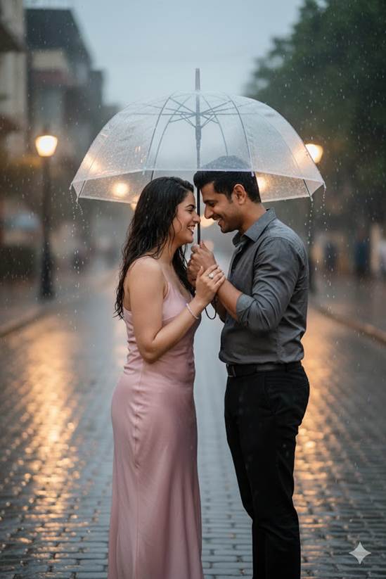 Visualize a romantic pre-wedding photo in the soft rain. The couple stands under a shared transparent umbrella on a quiet cobblestone street. Drops of rain glisten like tiny diamonds around them. The bride wears a pastel slip dress, her damp hair clinging to her skin, her smile tender and unguarded. The groom, in a charcoal shirt and rolled sleeves, gently brushes raindrops from her face, his gaze calm and full of warmth. Their clothes are slightly soaked, but neither of them cares — their laughter fills the air louder than the rain itself. Streetlights begin to glow, casting golden reflections on wet stone. The moment feels like a movie — imperfect, spontaneous, poetic. The umbrella fogs slightly from their closeness, their foreheads nearly touching, the world melting into mist behind them. The scent of rain and earth surrounds them, and all that remains is love, quiet and infinite.(the exact face as the uploaded image, no alteration, 100% identical)