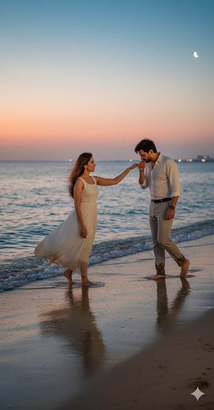 Visualize a pre-wedding portrait taken at a quiet beach during twilight, just when the last orange hues of sunset fade into blue. The ocean lies calm and endless, reflecting the sky’s soft pastels. The bride stands barefoot near the shore, her light chiffon dress swaying with the sea breeze. The groom, dressed in an off-white shirt and light trousers, walks slowly toward her, his footprints fading behind him. They meet where the waves barely touch their feet, and he gently lifts her hand to his lips. The air carries the sound of waves and wind — no crowd, no decoration, only nature as their witness. The moment feels like a memory unfolding in slow motion — her smile faint, his gaze full of awe, their silhouettes merging against the water’s shimmer. The camera catches the reflections on wet sand, glowing faintly under the first silver light of the moon. Every detail feels cinematic, minimal, and eternal — two souls framed by the sea and sky, lost in the rhythm of love.(the exact face as the uploaded image, no alteration, 100% identical)