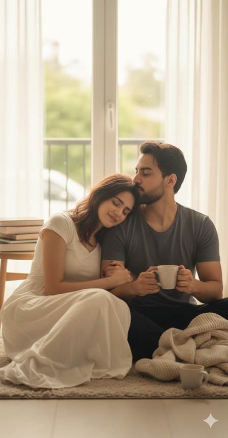 Picture an early morning scene inside a softly lit apartment. Pale sunlight filters through sheer curtains, washing the room in ivory calm. The couple sits near the window — the bride wrapped in a white cotton sheet, her hair still tousled from sleep. The groom wears a plain T-shirt, coffee mug in hand, smiling at her with sleepy tenderness. There’s no posing — only glances, warmth, and quiet familiarity. She leans into his shoulder; he kisses the top of her head. The air feels intimate and cinematic, like the world hasn’t yet woken up. Books, soft blankets, and half-drunk coffee cups decorate the background naturally. Outside, faint birdsong. The entire moment feels unfiltered — pure emotion in soft morning light. It’s love not in grand gestures but in stillness — the kind that exists between breaths and shared silences.(the exact face as the uploaded image, no alteration, 100% identical)