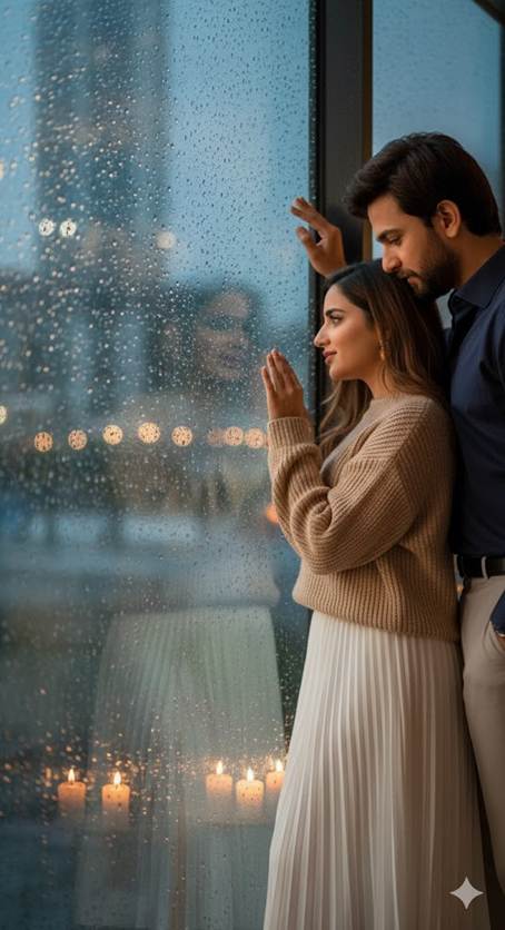 Visualize an indoor pre-wedding moment captured near a large window on a rainy evening. The glass glistens with raindrops, and beyond it, blurred lights glow softly. The bride leans against the window frame, wearing a soft beige sweater and white skirt, her reflection merging with the rain outside. The groom stands close, one hand resting beside her, the other gently touching her cheek. Their faces are inches apart, their expressions serene, words unspoken but understood. Candlelight flickers behind them, casting warm tones over cool raindrops. The window becomes a poetic canvas — a mix of gold, blue, and reflection. The entire mood feels still, slow, and cinematic. No pose feels forced; it’s simply love existing in the quietest hour. The shot looks like a film still — emotional, timeless, and wrapped in tenderness.(the exact face as the uploaded image, no alteration, 100% identical)
