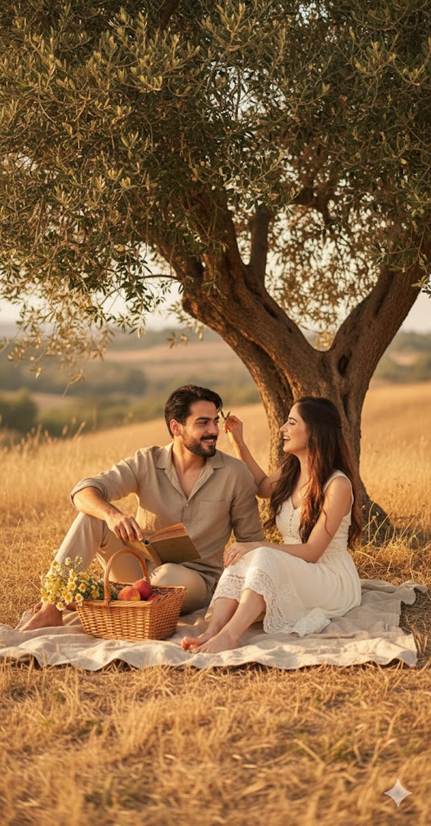 Picture a peaceful countryside evening under an old olive tree. The couple sits on a linen blanket spread over golden grass. The bride wears a light ivory summer dress with delicate lace details, her bare feet tucked beneath her. The groom, in a muted beige shirt and khaki pants, leans back with a book in his hand, pretending to read as she laughs softly beside him. Between them rests a basket with flowers and a few wild peaches. Sunlight filters through the branches, scattering dappled gold across their faces. The wind rustles the leaves, and everything feels calm, timeless, and slightly nostalgic. He turns his head toward her, his smile tender; she reaches to pluck an olive leaf and tucks it behind his ear, laughing again. The scene isn’t about grandeur — it’s about stillness, laughter, and love that feels like home. The photo breathes warmth and peace, like an old film still — full of soul and simplicity.(the exact face as the uploaded image, no alteration, 100% identical)