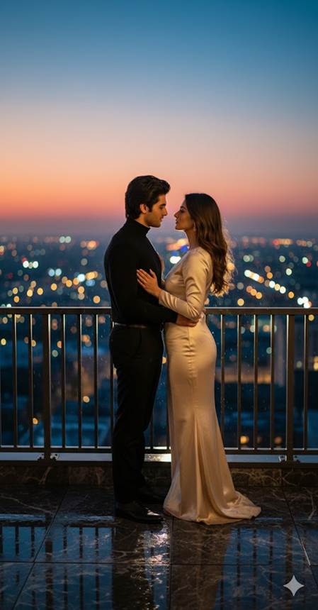 Envision a rooftop pre-wedding scene right after sunset, when city lights begin to sparkle below. The couple stands near the edge, the wind gently lifting her hair. She wears a minimalist satin gown in champagne color, its smooth texture catching light from distant buildings. The groom wears a classic black turtleneck and tailored trousers — sharp, yet understated. The mood is cinematic, elegant, and quiet. Behind them, skyscrapers blur into a sea of gold and blue light. They stand close, her hand resting softly on his chest, their eyes locked in a slow, unspoken conversation. A faint drizzle has left the railing wet, and reflections shimmer faintly on the marble floor. The world around them is alive but distant — up here, it’s only them. The city hum fades, and time pauses. Their closeness feels electric yet peaceful, like two constellations aligned just for one night.(the exact face as the uploaded image, no alteration, 100% identical)