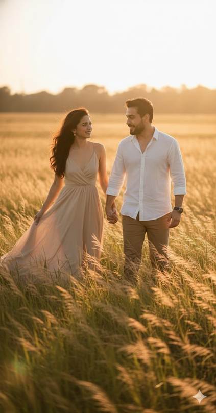 Imagine a serene pre-wedding portrait during late afternoon golden hour, when the sunlight feels like liquid amber spilling across the landscape. The couple stands in an open meadow, surrounded by whispering grass that moves gently in the wind. The bride wears a soft beige maxi dress, the fabric flowing like air around her legs, her hair open and wild, touched by the golden sun. The groom stands beside her in a white linen shirt, the top buttons undone, his look relaxed yet timeless. They are not posing; instead, they walk slowly, their fingers brushing together as the breeze carries laughter through the scene. The light catches their silhouettes — warm, imperfect, and breathtakingly real. The mood is cinematic but deeply human — no grandeur, only intimacy wrapped in sunlight. Her eyes meet his, and he pulls her gently closer; her dress catches the wind just as the sun slips lower, wrapping them in liquid gold. The whole moment feels suspended in time — fragile, romantic, and endless.(the exact face as the uploaded image, no alteration, 100% identical)
