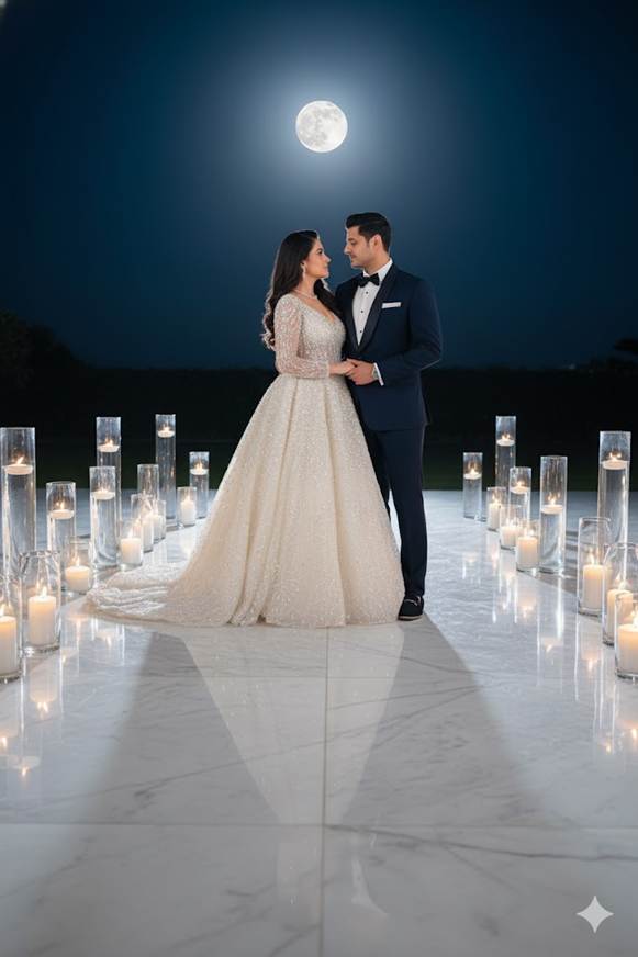 Envision a modern luxury wedding taking place in an open courtyard made entirely of white marble. The night sky above glows with a full moon, reflecting off the smooth floor. The bride wears a crystal-embroidered ivory gown that catches every ray of moonlight, making her appear almost celestial. The groom, in a dark tailored tuxedo with a silver pocket square, stands beside her, his hand gently resting on her waist. Around them, tall glass cylinders hold floating candles, creating pools of light that dance on marble. Their faces glow softly, caught between moonlight and firelight. The scene feels divine — elegant, timeless, and modern all at once. They don’t look at the camera; instead, they look at each other — lost in a quiet promise under the night sky. Every detail whispers luxury wrapped in serenity.(the exact face as the uploaded image, no alteration, 100% identical)