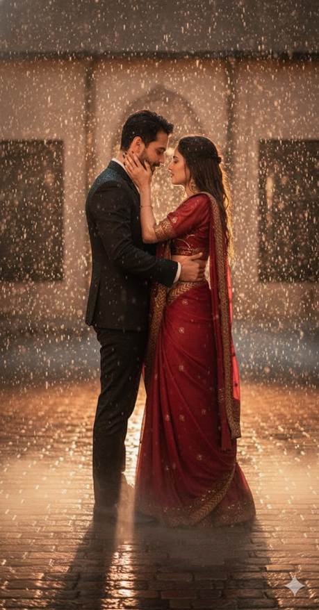 Visualize a moody, romantic wedding scene under soft rainfall. The couple stands in the middle of an open courtyard, surrounded by faint mist. The bride’s silk lehenga darkens slightly with rain, shimmering beautifully under the dim light. The groom, in a black tuxedo, holds her close, one hand shielding her face with his palm. Raindrops fall around them like glitter, the reflection on wet tiles glowing in warm tones. Their hair and clothes are slightly damp, adding realism to the emotion. The light hits them from behind, creating a faint golden halo. No props, no artificial perfection — only real love caught in rainlight. The atmosphere feels cinematic, fragile, and deeply romantic, as if the world paused to watch their story unfold in droplets and silence.(the exact face as the uploaded image, no alteration, 100% identical)
