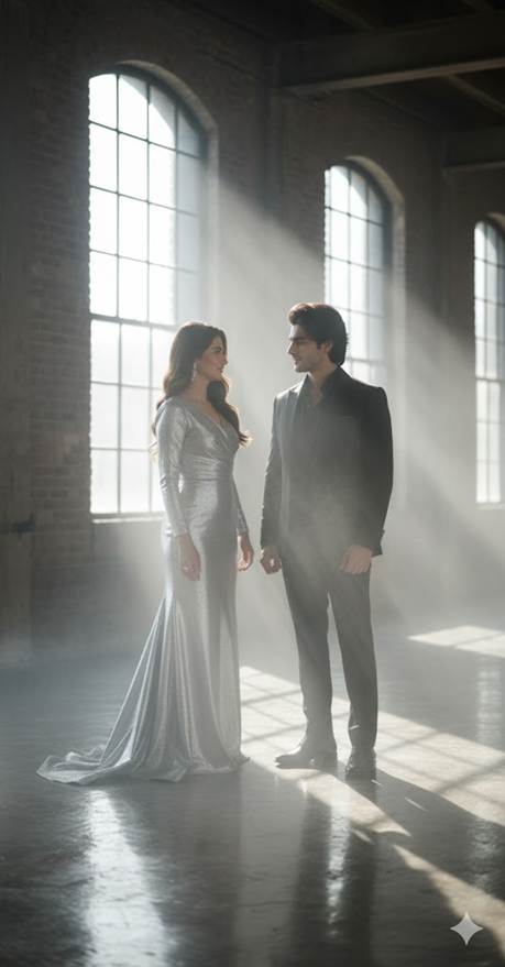 Imagine a cinematic wedding shoot set in an old warehouse turned into an art space. The floor glistens with faint mist, light beams cutting through from tall windows. The bride wears a metallic silver gown — minimal but bold — and the groom wears a charcoal black suit with a satin shirt. The light plays with shadows, outlining their forms as if caught inside a film scene. They don’t face each other directly; instead, they stand slightly apart, exchanging glances through the haze. Between them, sunlight and smoke mix into an ethereal silver glow. Every detail — the cool air, the faint echo of footsteps, the soft reflection on the floor — feels like a dream. It’s love reimagined in modern art form: edgy, elegant, emotional, and surreal.(the exact face as the uploaded image, no alteration, 100% identical)