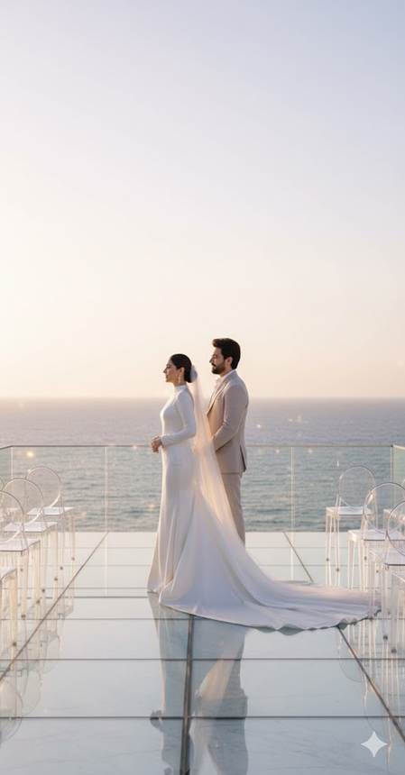 Visualize a minimalist modern wedding on a high glass platform overlooking endless sky and ocean. The design is simple — clean white marble floor, no decorations except transparent chairs and a single white aisle. The bride wears a sleek fitted gown with a dramatic train that flows like water, her hair pulled into a polished bun. The groom stands beside her in a beige tuxedo, open collar, no tie — effortlessly elegant. The sunlight reflects off the glass panels, creating soft golden flares across their faces. A faint breeze moves through, lifting her veil and catching the light like silk in motion. There are no guests, no crowd — only sky, sea, and serenity. The mood is pure calm luxury, modern simplicity elevated by emotion. Every reflection looks like art — love meeting light in its most graceful form.(the exact face as the uploaded image, no alteration, 100% identical)