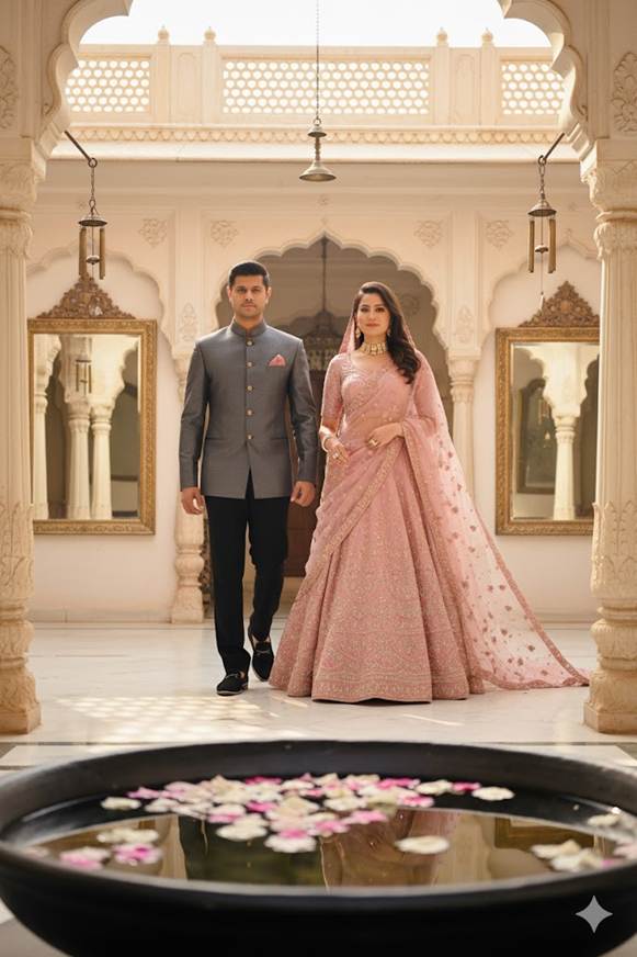 Picture a fusion wedding that blends old charm with modern grace. The setting is an antique haveli courtyard with marble pillars and vintage mirrors. The bride wears a pastel rose lehenga with thread embroidery — soft, royal, yet modern. The groom, in a contemporary bandhgala, complements her perfectly. Between them lies the soft sound of wind chimes and floating petals in a water bowl. The light filters through jaali windows, scattering golden patterns on their faces. They walk slowly through the courtyard, her veil brushing against the marble floor. The moment feels like stepping into a timeless poem — old-world warmth meeting new-age simplicity. Every frame glows with nostalgia and elegance, like history breathing in love again.(the exact face as the uploaded image, no alteration, 100% identical)