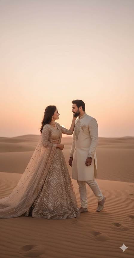 Imagine a luxury wedding set in the heart of a vast, golden desert. The sun has begun to set, painting everything in soft amber and rose gold. The bride wears a champagne-toned lehenga with geometric sequins that glimmer subtly in the dying light. Her dupatta flows behind her like desert silk, catching the breeze. The groom, in a crisp ivory sherwani with gold detailing, walks toward her across the dunes. Their silhouettes meet against the vast horizon, a surreal blend of opulence and stillness. No crowd, no sound — only sand, sky, and the faint whisper of wind. The light shifts every second, turning everything around them into a living painting. They stand close, her hand on his cheek, eyes reflecting the sunset. The photo captures the poetry of modern love in a timeless landscape — luxurious yet stripped of noise, intimate yet infinite.(the exact face as the uploaded image, no alteration, 100% identical)