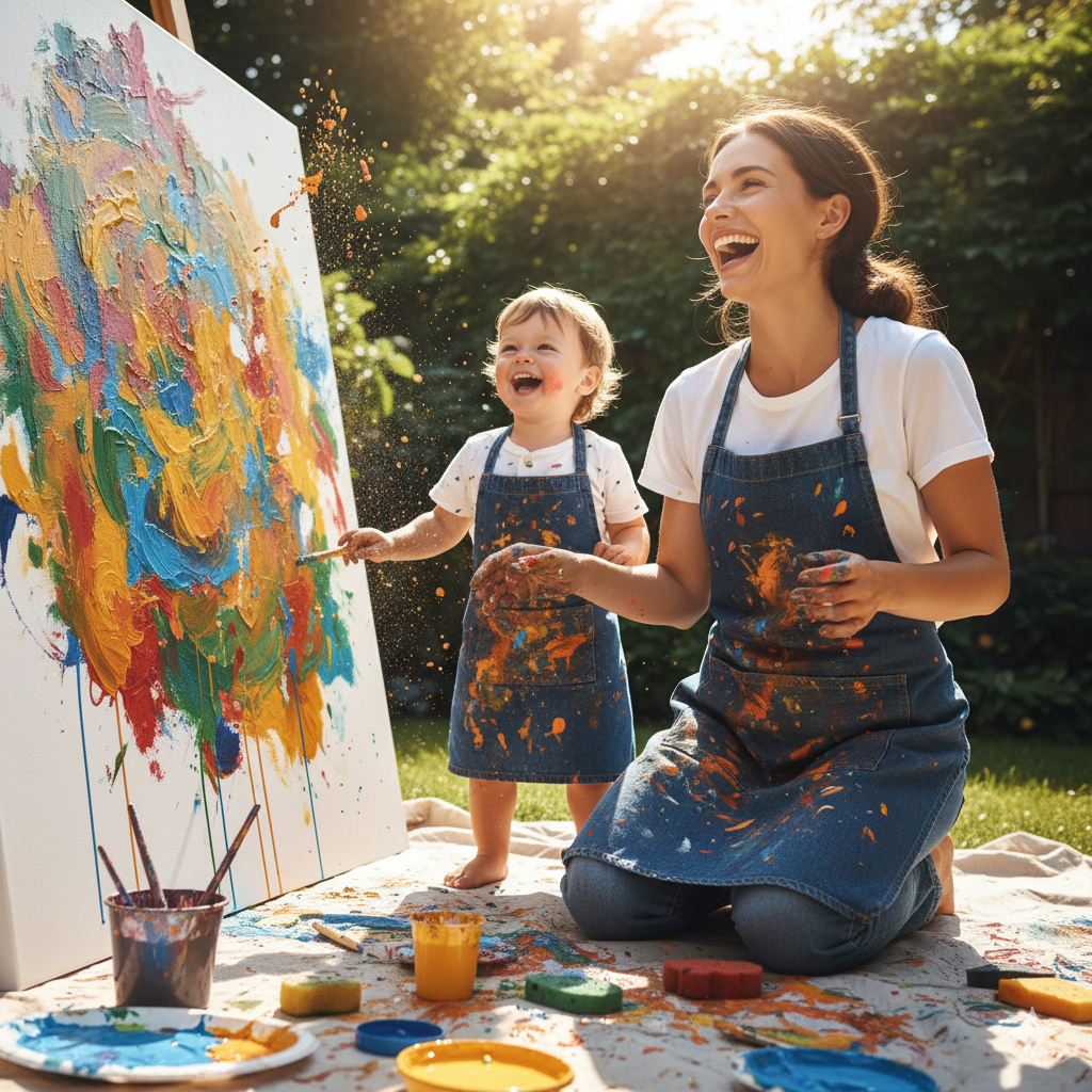 Prompt 6: Vibrant, high-resolution image of a mother and her son, both in paint-splattered aprons, laughing as they create a colorful mural on a large canvas outdoors. The setting is a sunny art studio garden, featuring bright paints, artistic mess, and pure creative joy. Dynamic angle, natural light, expressive movement.
