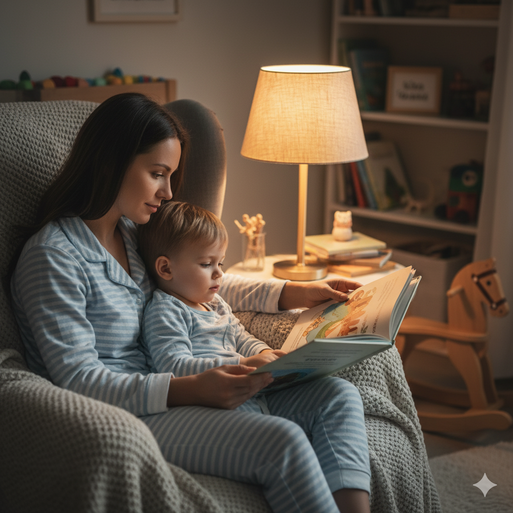 Prompt 5: Intimate, high-resolution photo of a mother and her son, both wearing cozy pajamas, reading a bedtime story together in a softly lit nursery. The mood is tender and peaceful, with warm lamplight, comfortable blankets, and a sense of security. Close-up, soft focus, quiet moments.