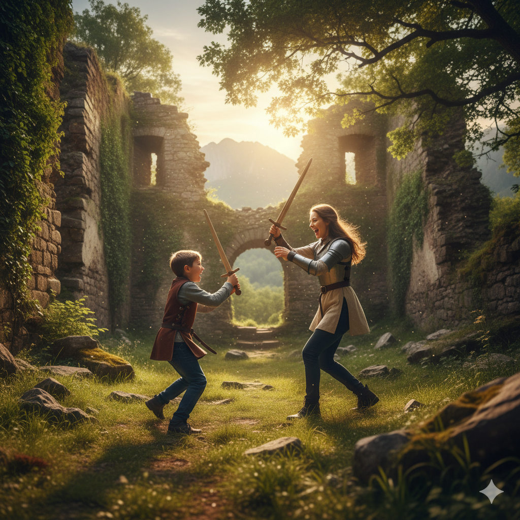 Prompt 3: Photorealistic image of a young mother and her son, both dressed as medieval knights, playfully sword-fighting with wooden swords in the ruins of an ancient castle. The setting is dramatic and historic, with crumbling stone walls, lush green foliage, and a sense of epic fantasy. Golden hour light, dynamic action shot, joyous energy.