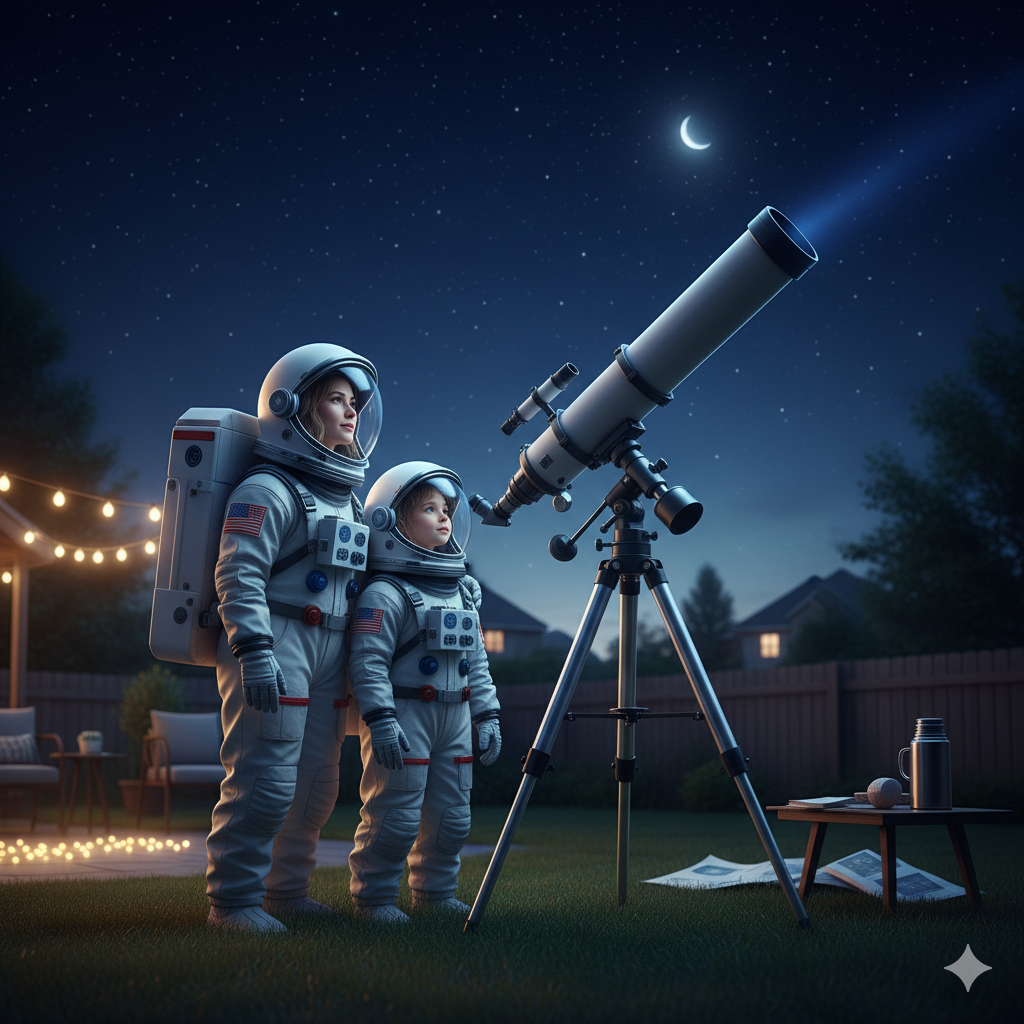 Prompt 2: Candid, high-resolution photo of a mother and her son, both in astronaut costumes, stargazing with a telescope in a dimly lit backyard. The atmosphere is magical and dreamy, with a clear night sky, twinkling stars, and a sense of shared wonder. Wide-angle shot, soft ambient light, whimsical imagination.