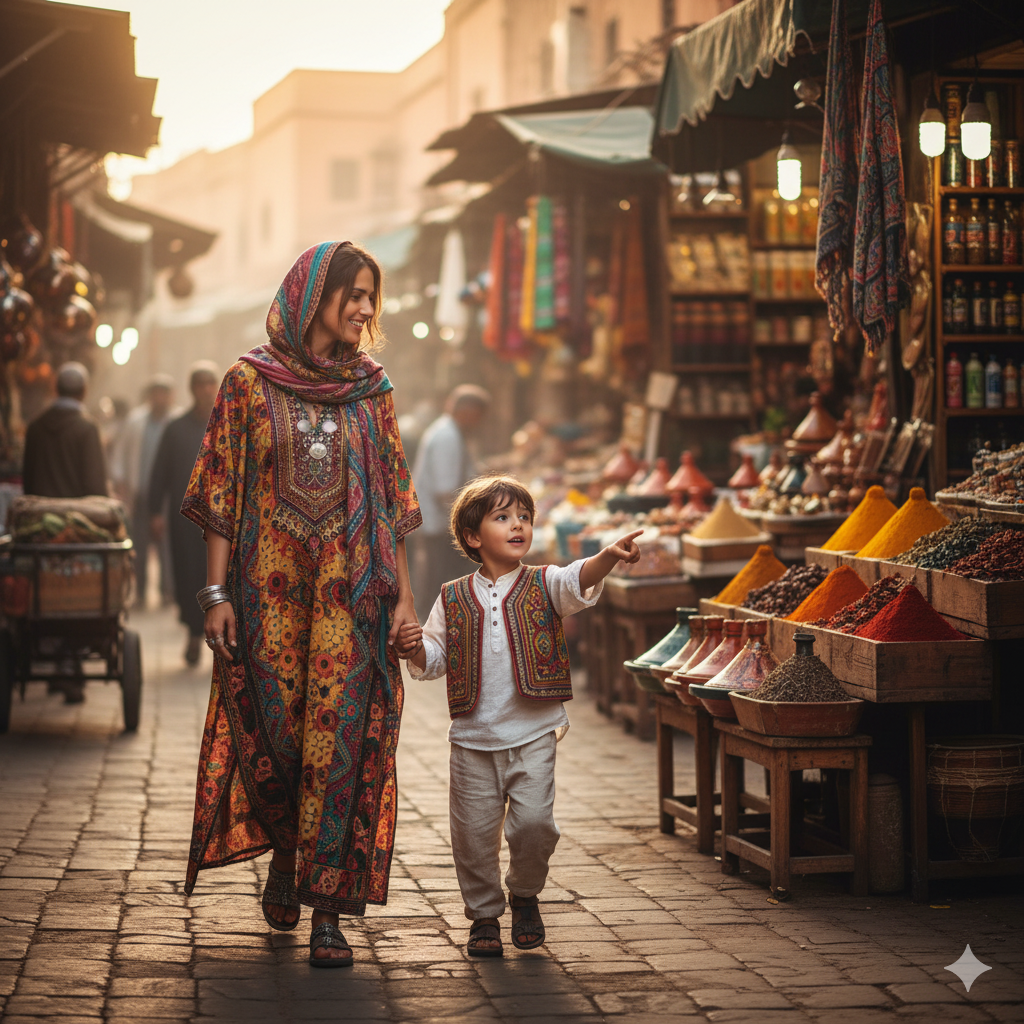 Prompt 1: Authentic, high-resolution image of a mother and her young son, both in vibrant bohemian-style outfits, exploring a bustling Moroccan souk. The scene is filled with colorful textiles, exotic spices, a sense of adventure, and genuine curiosity. Dynamic street photography, shallow depth of field, warm desert light.