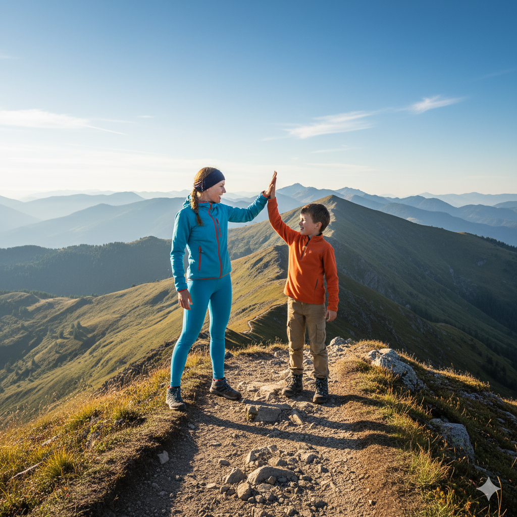 Prompt 8: Energetic, high-resolution photograph of a mother and her son, both wearing sporty activewear, high-fiving after reaching the summit of a scenic mountain trail. The backdrop is breathtaking, with expansive views, clear blue sky, and a sense of accomplishment. Wide landscape shot, bright daylight, triumphant feeling.