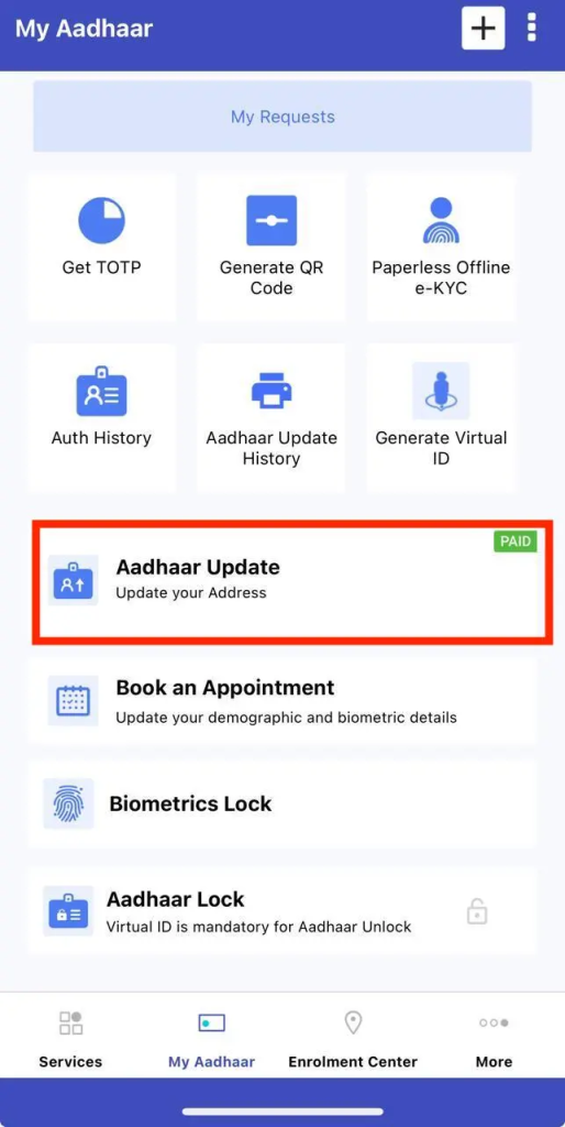 We open the app and navigate to the Update Aadhaar section. This option helps initiate the Aadhaar Mobile Number Change request.