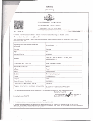 A Community Certificate is an official document that certifies the community classification of an individual as recognised by the Government of Kerala.