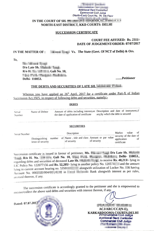 - Succession certificate (in large claims or disputes)